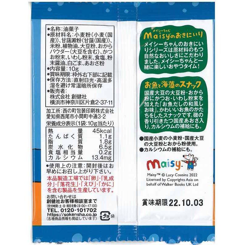創健社 メイシーちゃんのおきにいり お魚と海藻のスナックは、国産大豆の大豆粉・おから粉にかつお・いわし粉末を加えた「お魚だしの和風しお味」のかわいいお魚の形をした自然食品のスナックです。磯の香り引き立つ国産あおさ入り。カルシウムの補給にも。食べ切りサイズの10g×4連タイプ。