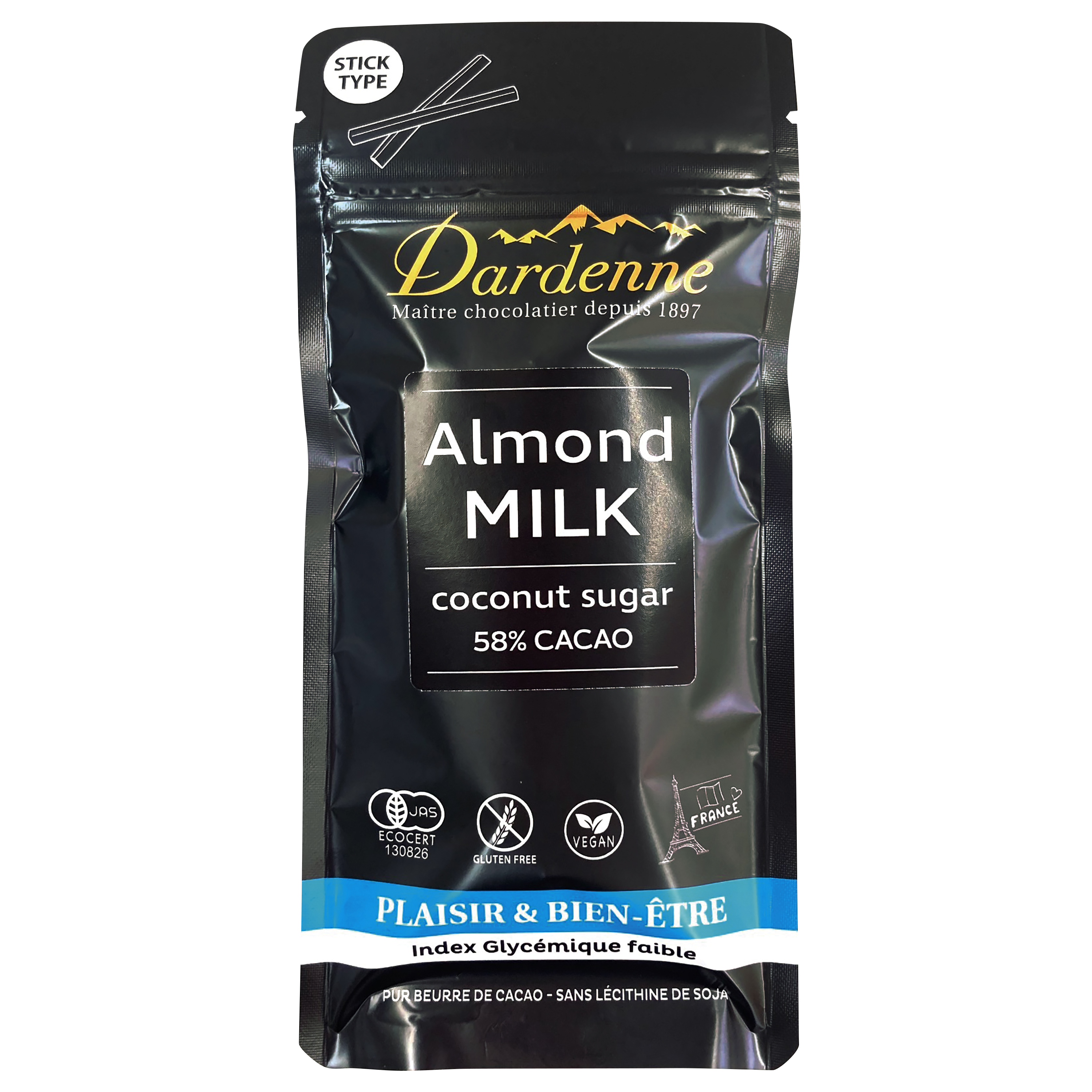 アルマテラ ダーデン有機ココシュガーチョコレート アーモンドミルクスティックは、砂糖・乳化剤不使用 ヘーゼルナッツの豊かな香りとアーモンドミルクのクリーミーな味わい スティックタイプ