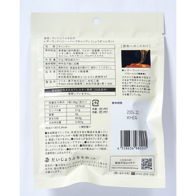| 麦芽飴(国内製造) 、てんさい含蜜糖、はちみつ、レモン果汁、生姜粉末、ハーブ粉末 (エキナセア、カミツレ、カキドオシ) 、プロポリスエキス |