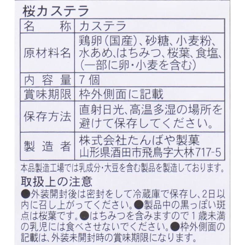 | 鶏卵(山形)、砂糖(てん菜:北海道)、小麦粉(北海道)、水あめ(甘藷澱粉(甘藷:鹿児島))、はちみつ(中国)、桜葉(中国)、食塩(国内産) |