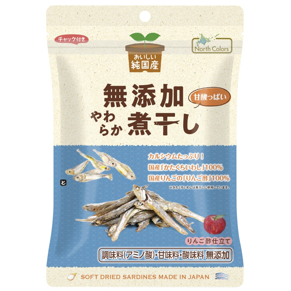 ノースカラーズ 純国産 やわらか煮干しは、国産のりんご酢と黒酢で、やわらかさと程よい酸味を実現し、北海道産のてん菜糖でさわやかな甘さに仕上げました!カルシウムもたっぷりです!煮干しの食感が固すぎず、やわらかすぎず仕上げるところが、職人の腕の見せ所です!
