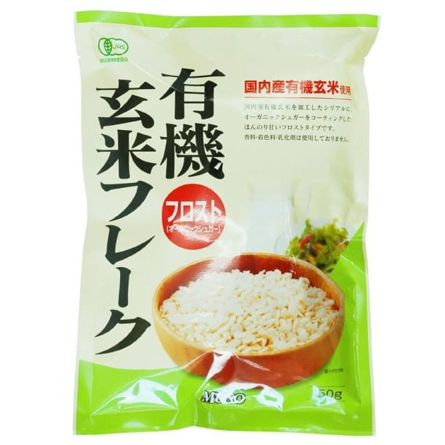 ムソー 有機玄米フレーク・フロストは「国内産有機玄米」を手軽に召し上がれるよう加工した自然食品です。有機JAS認定のシリアル食品です。砂糖をコーティングした、ちょっぴり甘いフロストタイプ。
