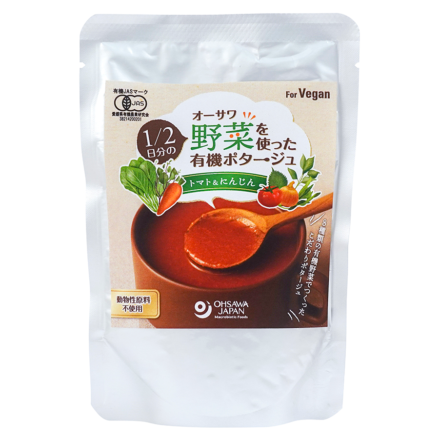 オーサワジャパン オーサワ 1/2日分の野菜を使った有機ポタージュ(トマト&にんじん)は、 8種類の有機野菜でつくったこだわりポタージュ トマトとにんじんをベースに、甘味料をつかわずに有機野菜の旨みと甘みを引き出した