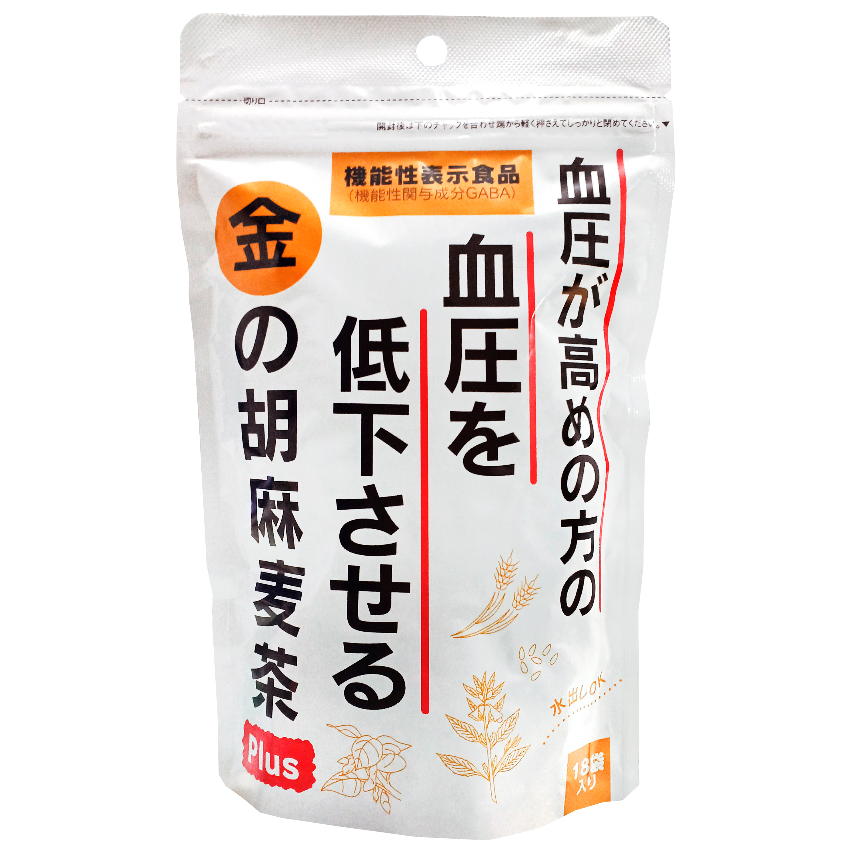 小川生薬 血圧が高めの方の血圧を低下させる 金の胡麻麦茶Plusは、国産大麦・黒豆・金胡麻にGABAをプラス 香ばしく甘みがあり、すっきりとした味わい