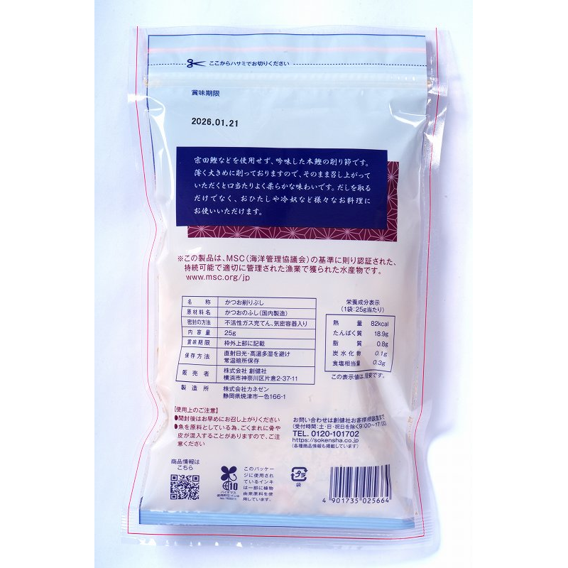 創健社 花かつおは、宗田鰹などを使用せず、吟味した本鰹の削り節です。薄く大きめに削っておりますので、そのまま召し上がっていただくと口当たりよく柔らかな味わいです。おひたしや冷奴など様々なお料理にお使いいただけます。MSC認証。